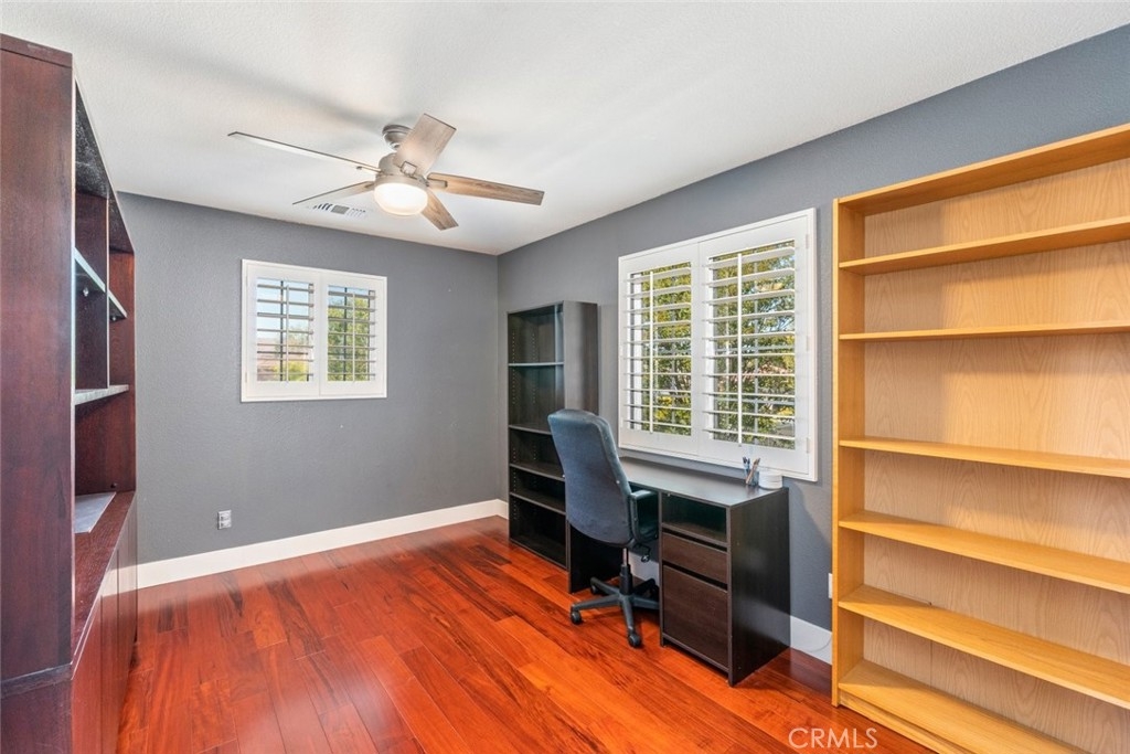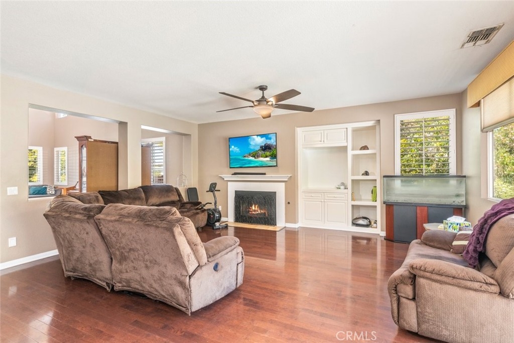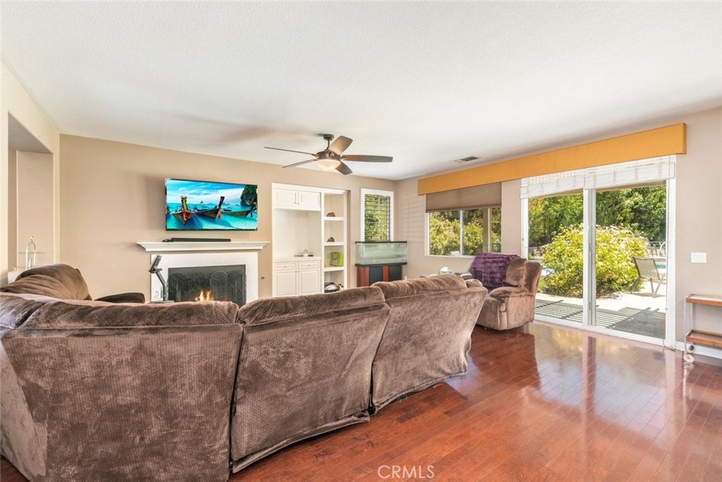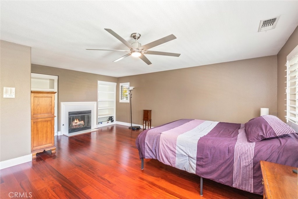 Noteworthy upgrades grace this home, including hardwood floors, bespoke built-ins, elegant plantation shutters, and ceiling fans for added comfort. The main floor hosts a bedroom with an adjacent bathroom, ideal for accommodating guests or loved ones. The family room is a haven of natural light, complemented by a cozy fireplace and built-in cabinets.