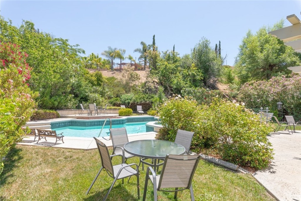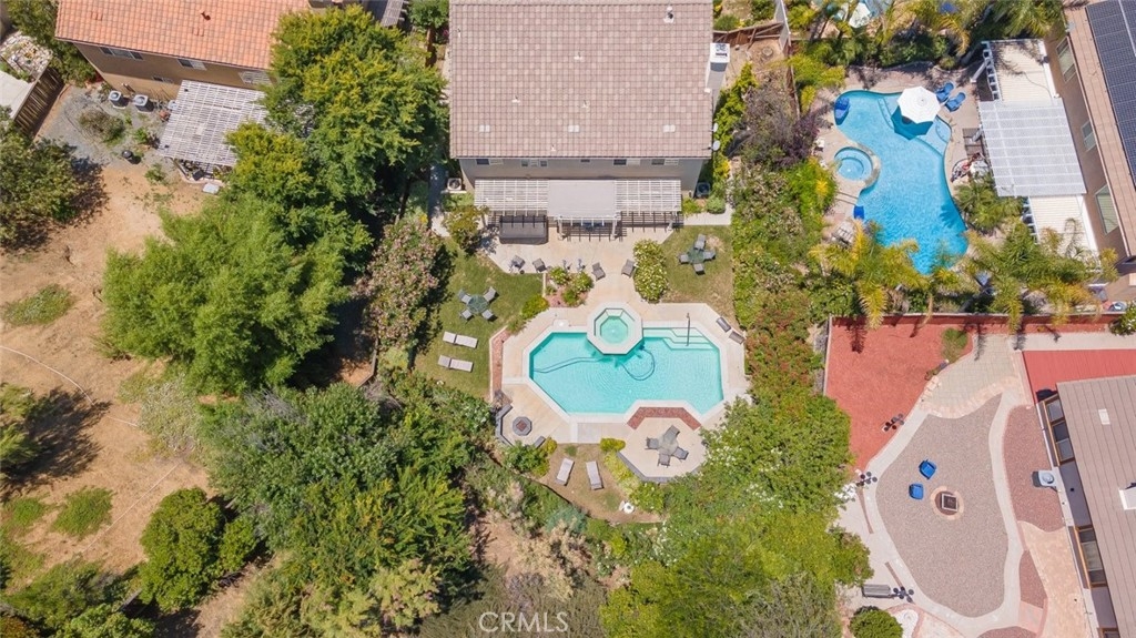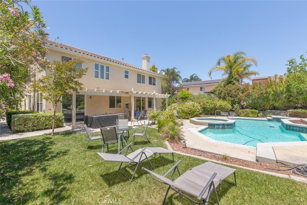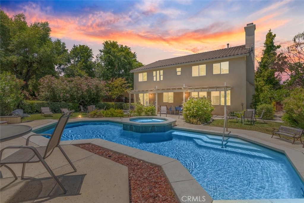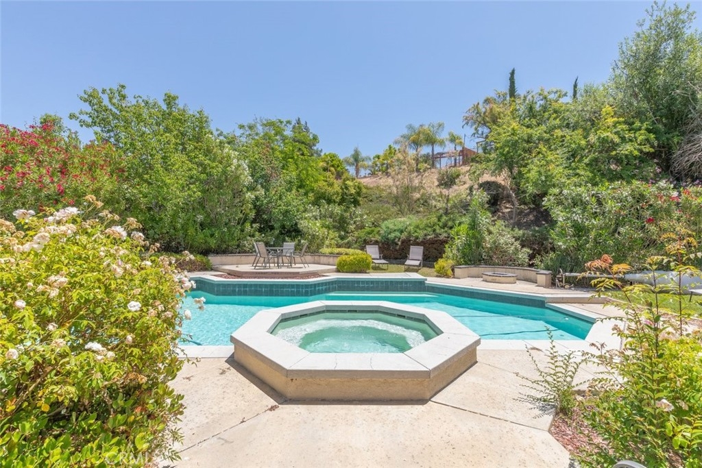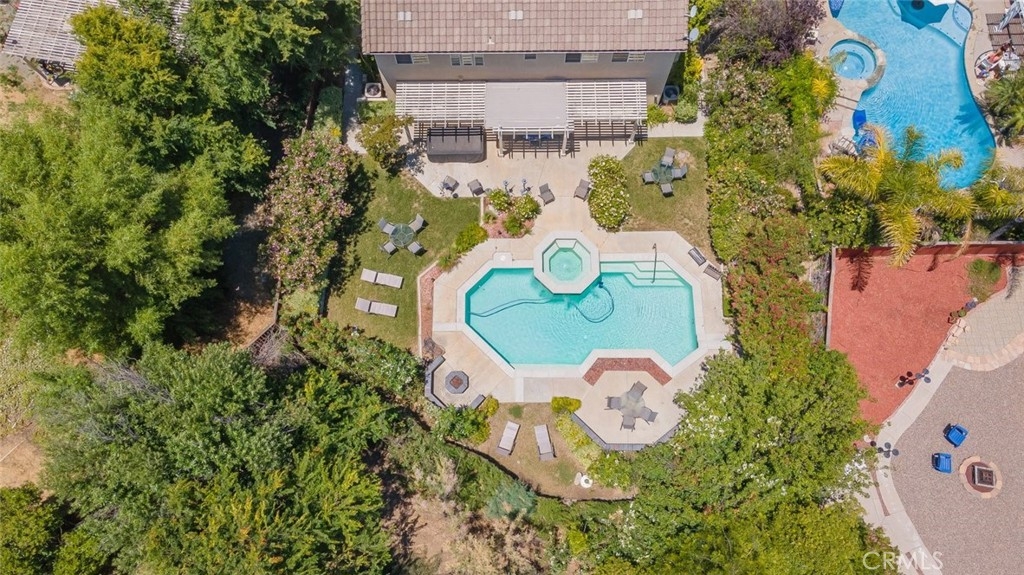 Retreat to the spacious primary suite featuring a cozy fireplace and a luxurious ensuite bathroom boasting an expansive vanity area, abundant cabinet space, and a sizable walk-in closet. Step outside to an enchanting backyard retreat complete with a pool, spa, covered patio, outdoor shower area, and a fire-pit with a seat wall—perfect for summer gatherings and relaxation.