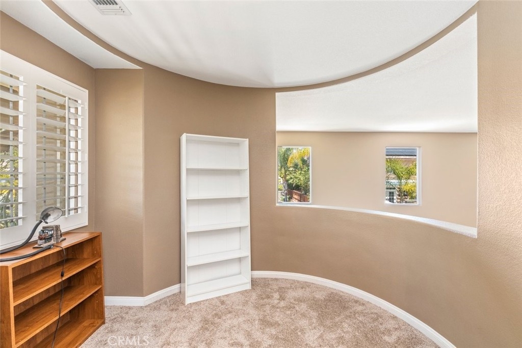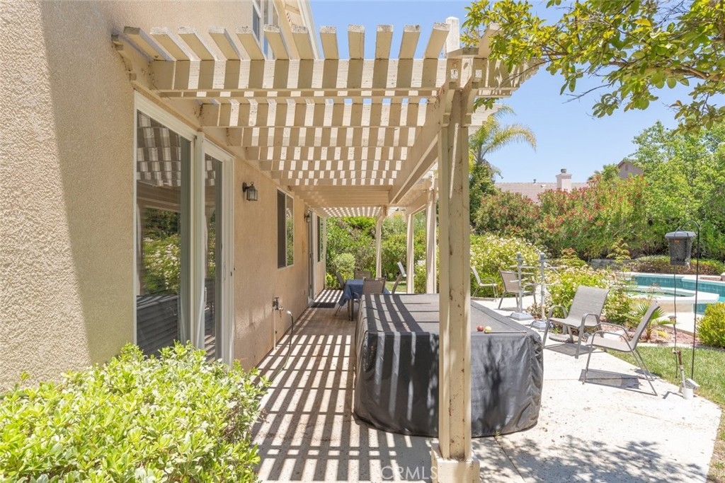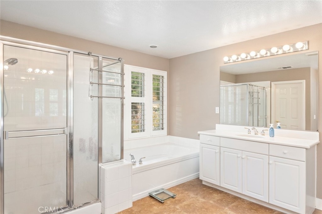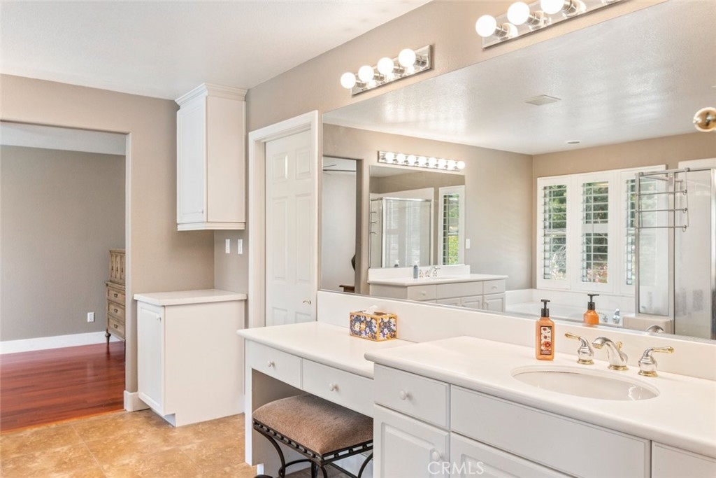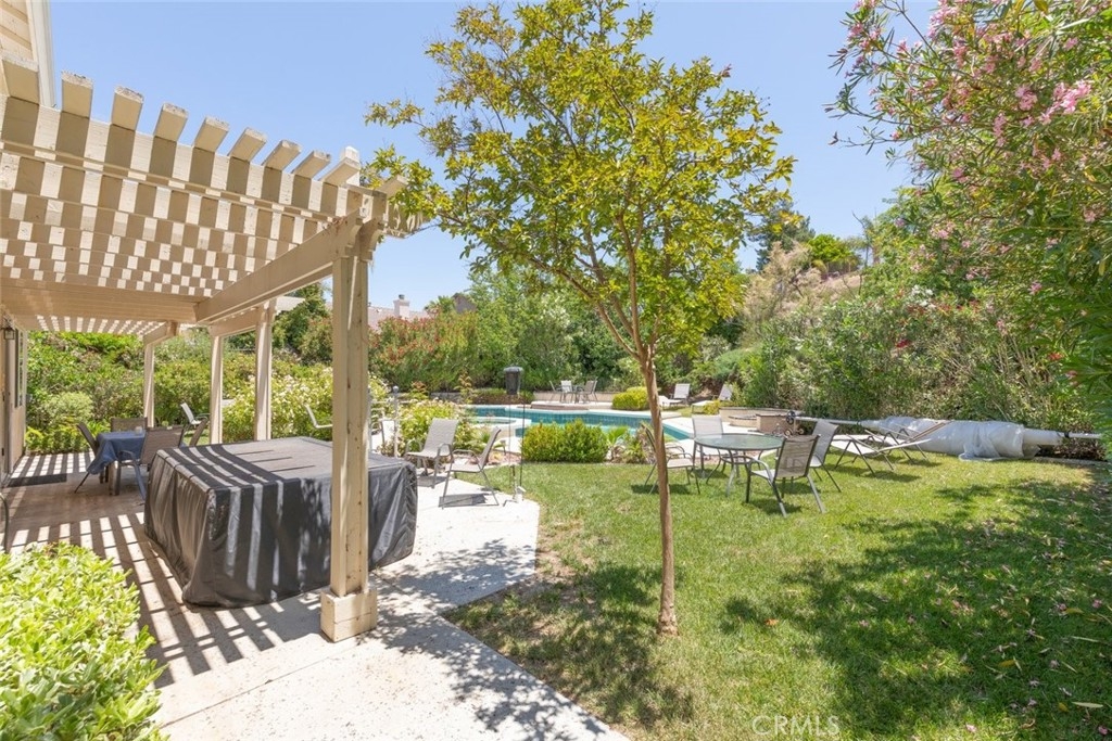 Retreat to the spacious primary suite featuring a cozy fireplace and a luxurious ensuite bathroom boasting an expansive vanity area, abundant cabinet space, and a sizable walk-in closet. Step outside to an enchanting backyard retreat complete with a pool, spa, covered patio, outdoor shower area, and a fire-pit with a seat wall—perfect for summer gatherings and relaxation.
