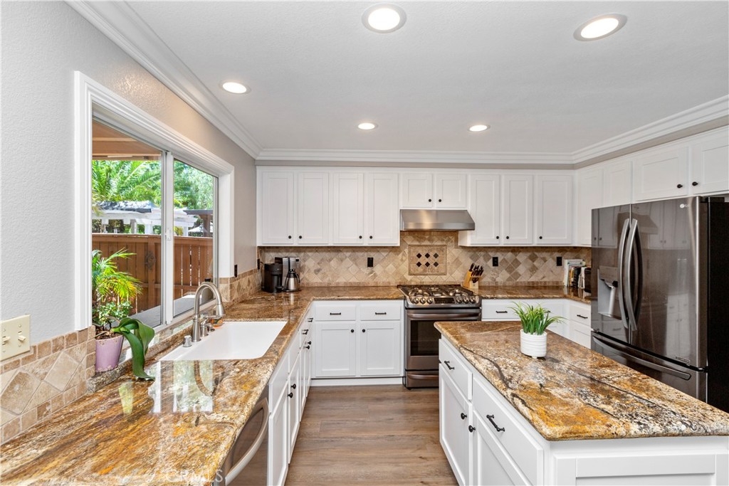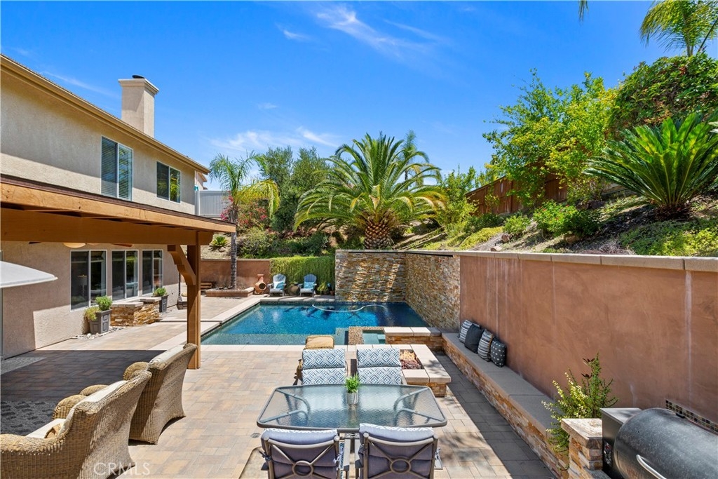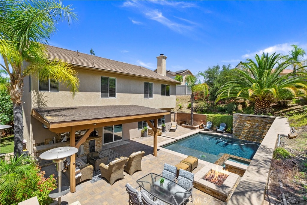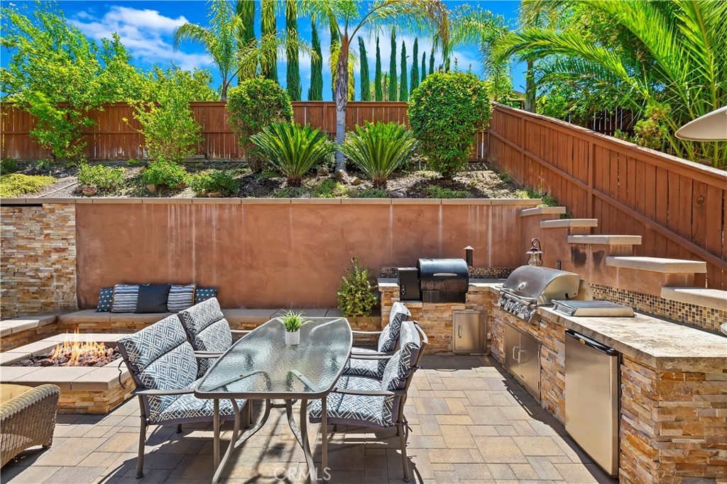 If you like entertaining in your backyard, then this is the home for you! Incredible pool and spa home with a complete outdoor kitchen and so much more. 2600 sf of modern, highly upgraded and remodeled living space on a 10,000 sf cul-de-sac lot. Home includes 4 bedrooms and a large loft with one bedroom on the main floor and 3 car garage. Newer luxury plank vinyl flooring with upgraded baseboards, stunning cased windows and beautiful crown moulding throughout. Dreamy gourmet kitchen with modern white kitchen cabinets with soft close drawers, stylish black hardware, granite countertop and island, stone backsplash and stainless steel appliances. Convenient desk area in the kitchen that will be so useful. Large family room with brick fireplace and custom wood mantle. Throughout the house there is newer neutral paint color, upgraded lighting, fixtures, hardware and ceiling fans. Other features include plantation shutters, whole house fan and sleek window blinds/shades. Downstairs bathroom is completely remodeled with marble counters and stunning Italian tile shower. Spacious master bedroom upstairs with gorgeous bathroom and walk-in closet. The garage has built-in garage storage cabinets, epoxy flooring and bolted jewelers safe that stays.The impressive backyard will not disappoint. An amazing Pebble tec pool and spa with a massive stacked stone bond beam with waterfalls along with glass tile accent. Ample Baja shelf area in the pool to accommodate little ones and swimmers that just want to chill in the shallow waters. Salt generator was just recently replaced. You can cook anything in the backyard with the comprehensive outdoor kitchen with two islands that include all this: barbecue grill, separate smoker, refrigerator, wine refrigerator, dishwasher and composite sink. The gatherings are going to be special! The backyard also has full roof patio cover with lights, ceiling fan, mounted television, sound speakers and a built-in firepit with seating area! At one side of the house is artificial grass, perfect for a dog run and the other side has an outdoor shower and yes, it is heated. Large, landscaped side yard with a wrought iron fence and storage shed stays. What a sweet home in the highly desirable Vintage Reserve community with no HOA's. Close to schools, parks, shopping mall, restaurants, Harveston Lake and easy access to both the 15 and 215 freeways. Such a rare find!